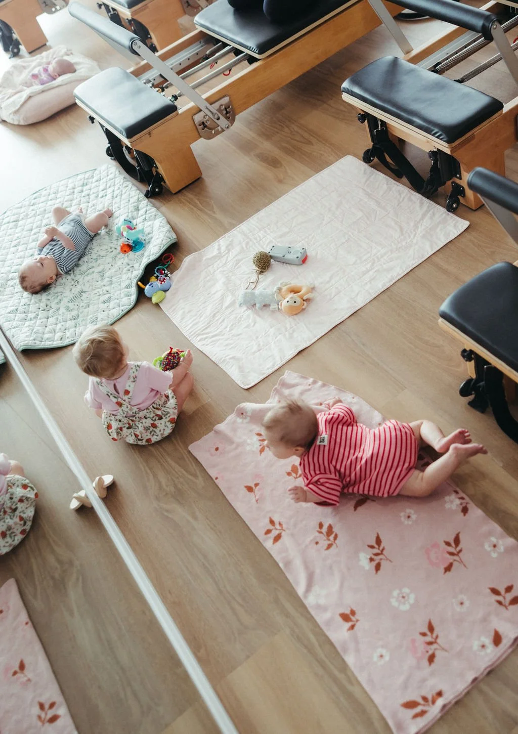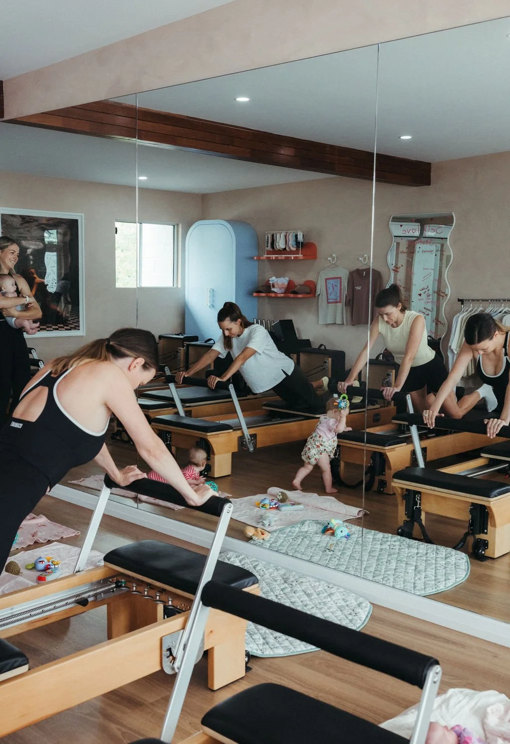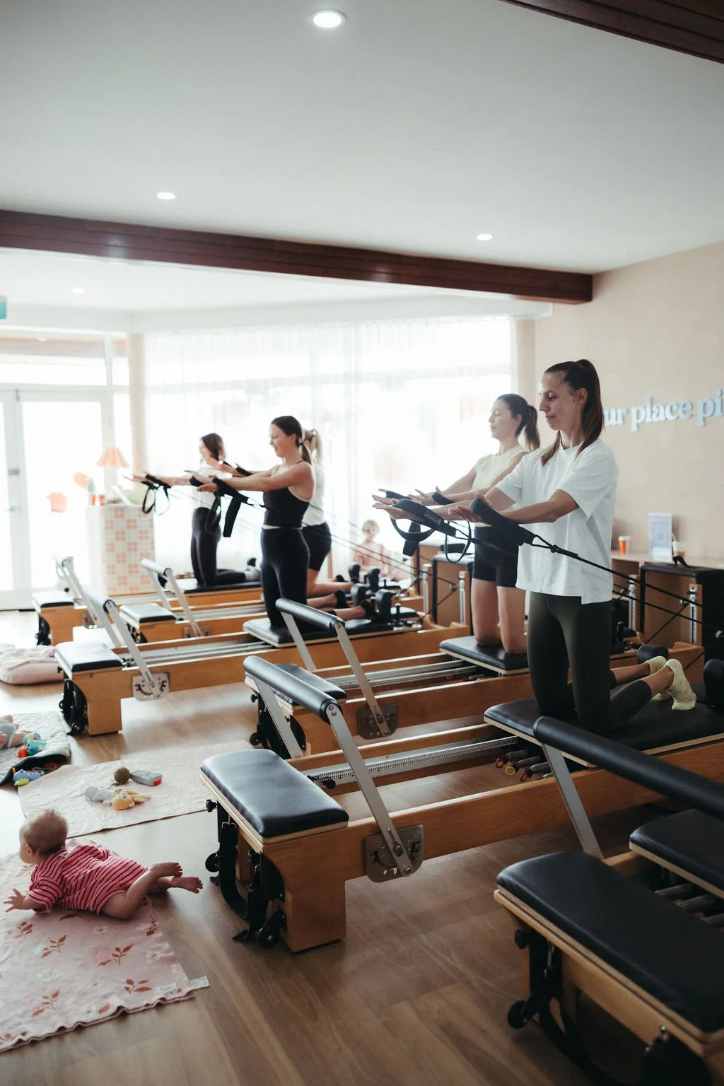 Your baby will be right beside your reformer in their pram, capsule, bassinet or on a mat next to you. Many babies sleep through the class, others enjoy watching the room or checking themselves out in the floor-to-ceiling mirrors.